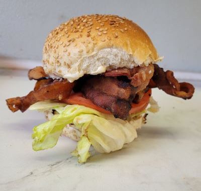 Crisp bacon, lettuce, & tomato with mayo on a toasted bun.