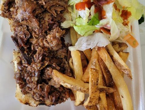 Hickory’s Dinner Platter July 5, 2018March 14, 2024 Choice of Sliced Steak, BBQ Pulled Pork, or BBQ Beef Brisket, served on bread with a side salad & hand-cut Idaho fries OR baked potato with butter and sour cream. Add Onions & Peppers – $1.00 extra. Related